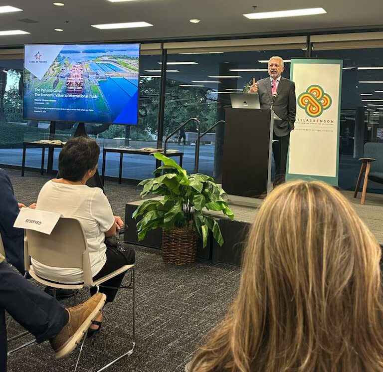 El administrador del Canal de Panamá, Ricaurte Vásquez Morales, visitó el campus de la Universidad de Texas en Austin para hablar sobre el valor económico y la importancia estratégica del Canal de Panamá en el comercio internacional. Su conferencia formó parte de la serie de Conferencias Mary Ann Faulkner sobre Asuntos Públicos y Política en América Latina.
